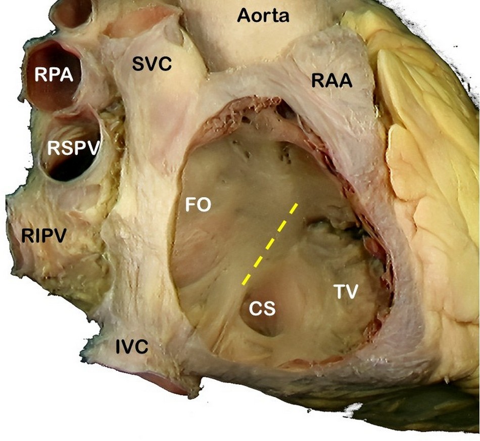 SVC: Superior vena cava, RPA: Right pulmonary artery, RSPV: Right superior pulmonary vein, RIPV: Right inferior pulmonary vein, IVC: Inferior vena cava, RAA: Right atrial appendage, FO: Foramen ovale, TV: Septal leaflet of the tricuspid valve. The yellow line shows the location of the "Tendon of Todaro".