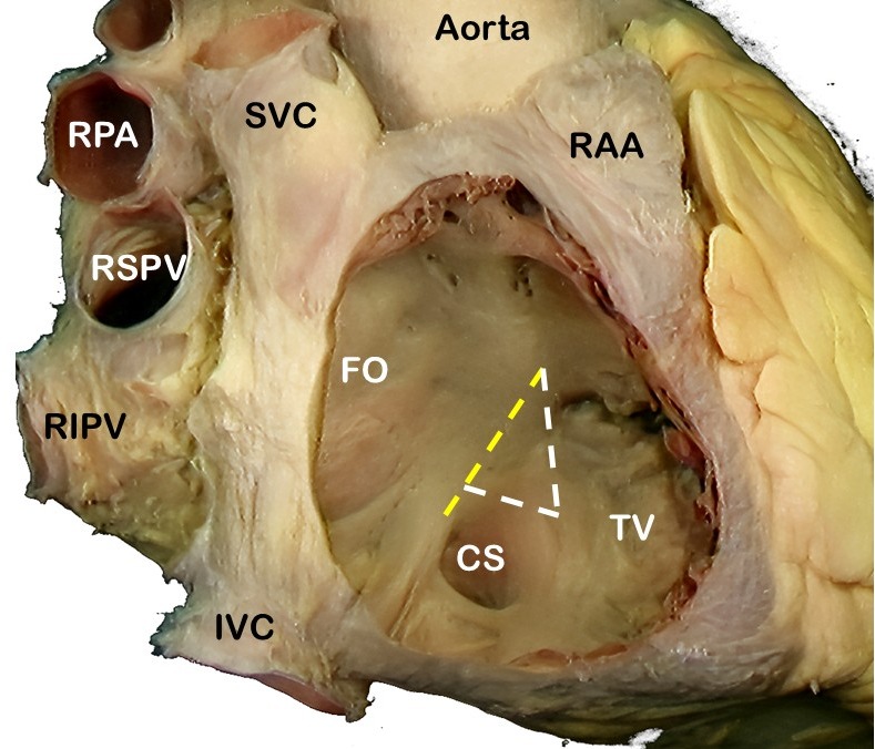 Image 2: SVC: Superior vena cava, RPA: Right pulmonary artery, RSPV: Right superior pulmonary vein, RIPV: Right inferior pulmonary vein, IVC: Inferior vena cava, RAA: Right atrial appendage, FO: Foramen ovale, TV: Septal leaflet of the tricuspid valve. The yellow line shows the location of the "Tendon of Todaro". The complete triangle is the triangle of Koch.