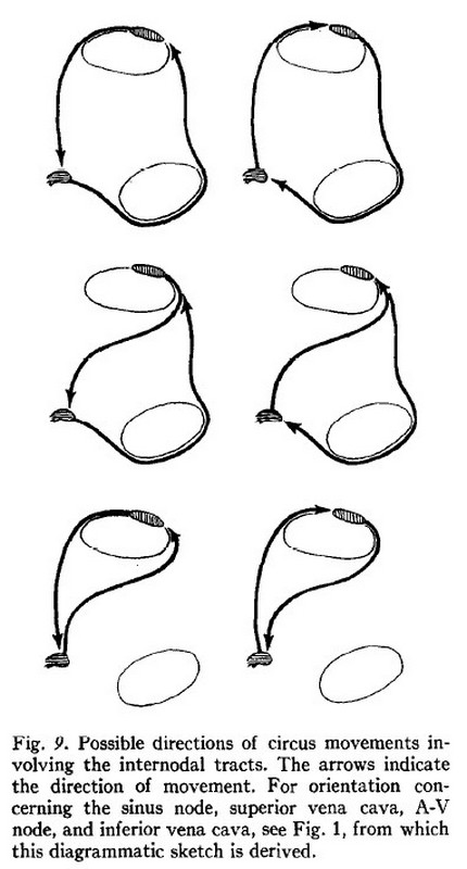 Electrical conduction in a parallel bundle can go either way (same as in an electrical cable). Because the impulses are generated in the SA node, they will go towards the AV node. James argued that because of the fiber arrangement of these internodal tracts, they form circles that can allow the electrical impulse to revert towards the SA node. He calls this a “circus movement” we call that today “reentrant circuits”. These reentrant circuits can be one of the many causes of cardiac arrhythmias, especially atrial fibrillation.