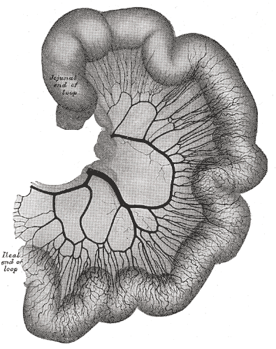 There is no clear anatomical boundary between the jejunum and ileum, as they blend smoothly one into the other. There are several gross changes from jejunum to ileum, one of them being that the complexity of the mesenteric arterial arches increases from proximal to distal. See the accompanying image. Click on it for a larger depiction.