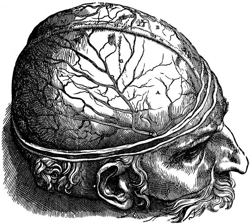 Brain dissection. dura mater in situ (Vesalius)