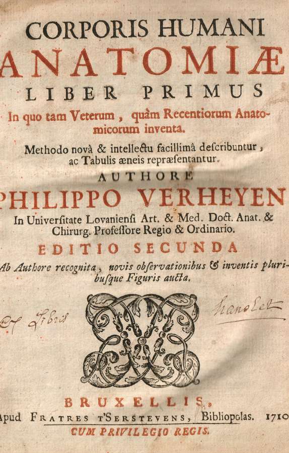 Personal note: I am proud to have in my library catalog a copy of the second edition of Philippo Verheyen's “Corporis Humani Anatomiae, Liber Primus”, published in 1710 in Brussels by the printer house of Fraters Serstevens. The book is signed by an Ex-Libris by "Hanolet". I have not been able to find more information on this prior owner of this book. An image of the title page is depicted in this article. Dr. Miranda