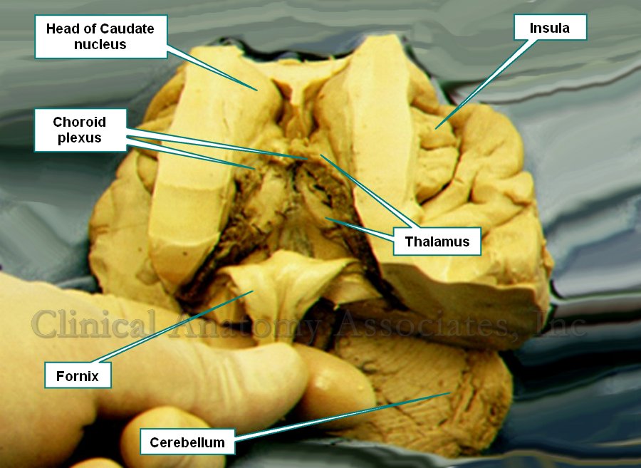 In the accompanying image the thalamus is found covered by the choroid plexuses of the lateral ventricle.