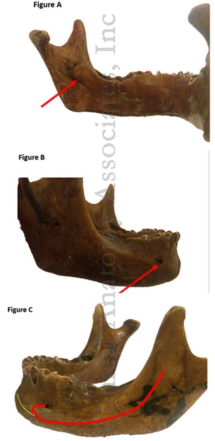 Different anatomical studies show that the mandibular canal not only finishes at the mental foramen, but it could divide itself giving an incisive canal which runs anteriorly onto the incisal region (Figure C, yellow line). When it doesn’t continue as an incisal canal, the neurovascular elements go anteriorly through the cells of the spongy bone tissue.