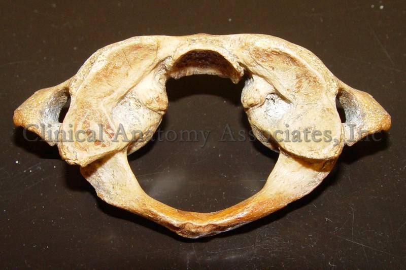 The [atlas] is a name used for the first cervicalvertebra, since this vertebra bears the weight of the head. The atlas is an atypical vertebra as it does not have a vertebral body and is composed by an anterior and a posterior arch. As a cervical vertebra, the atlas does have two lateral foramina transversaria, for the passage of the vertebral artery. The image depicts a superior view of the atlas and the articular surfaces for the atlantooccipital joint can be seen.