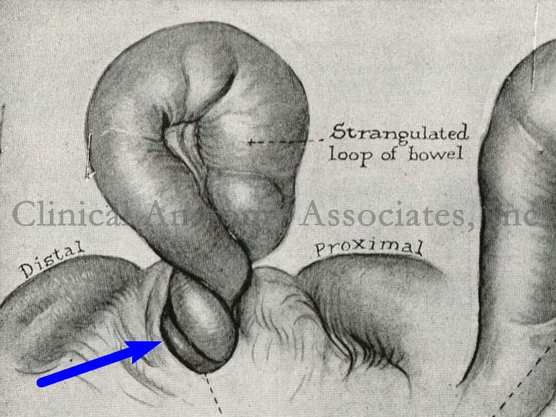 In the accompanying image by Thorek (1938), the arrow indicates the location of a mesenteric defect, being the cause for an internal hernia and intestinal torsion or volvulus. For more information and images, you can read this 2011 article by Timpone, V.M. et al. on "Abdominal Twists and Turns: Part I, Gastrointestinal Tract Torsions With Pathologic Correlation"