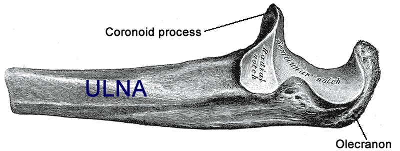 The [olecranon] is the bony prominence of the elbow, that what some call "the funny bone". It is hook-shaped and has a semilunar (half-moon shaped) area which forms part of the elbow joint, articulating with the trochlea of the humerus.