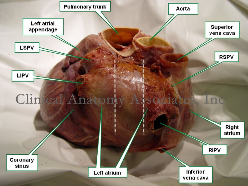 The cardiac base is formed mostly by the left atrium, which is flanked by the four pulmonary veins. The thoracic esophagus is located posterior to the left atrium, separated from the heart only by the pericardium. This is important for a transesophageal echocarcardiogram (TEE) where there are only soft tissues between the esophageal transducer and the heart. In the accompanying image, two dotted lines show the approximate area of location of the thoracic esophagus.